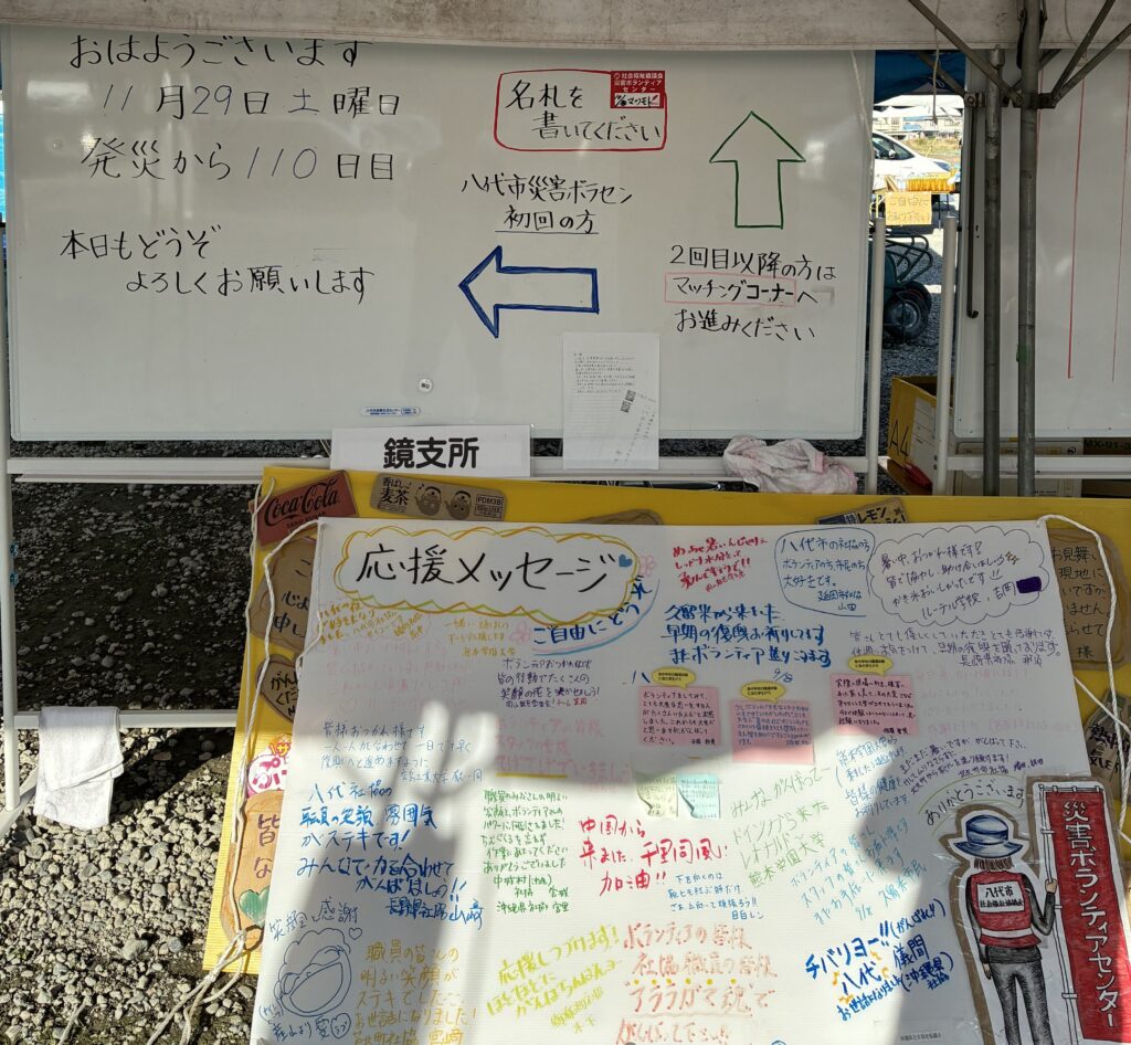 8月11日に発生した豪雨災害での災害ボランティア活動については、11月30日に八代市災害ボランティアセンターが閉所したことにより、災害ボランティアセンターでの活動は11月29日の活動をもって終了致しました。八代市災害ボランティアセンターは8月13日に開設され、8月20日より災害ボランティア活動が開始されました。災害発生から110日目をもって現状のニーズが全て完了したため11月30日で閉所となりました。これまで八代のために、熊本県内・県外から多くの皆さまにボランティア活動に参加していただきました。私も可能な限り参加はしましたが、遠方から参加していただいた方もたくさんおり、感謝しかありません。ありがとうございます。また、ボランティアセンターで活動された職員及び、関係者の皆さま、ごみの仮置き場で作業された皆さまにおかれましても大変お世話になりました。ありがとうございました。